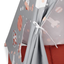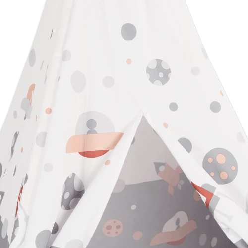 La tente indienne Cosmo Tipi pour enfants est l’endroit idéal pour vivre de grandes aventures sans quitter la maison. Un espace parfait pour les garçons et les filles, où ils peuvent passer des heures à jouer, imaginer et se détendre. Qui n’a jamais rêvé d’être dans un vaisseau spatial ? Ce tipi pliable pour enfants possède une fenêtre latérale pour pouvoir observer l’extérieur pendant que nous sommes à l’intérieur et ajouter plus de réalisme à ce jeu Montessori éducatif, pédagogique, imaginatif et symbolique. De plus, il comprend un protecteur rembourré qui offre un plus grand confort et nous isole du sol pour que nous puissions jouer entièrement protégés. Grâce à son tissu polyester imperméable, il est parfait pour rêver et créer des histoires passionnantes aussi bien à l’intérieur qu’à l’extérieur, placez-le sur la terrasse et/ou dans le jardin de votre maison ! Son design unique et unisexe, inspiré de l’univers. La structure de ce tipi pour enfants est faite de bois naturel pour être respectueuse de l’environnement. Il a été fabriqué sans l’utilisation de substances nocives, de sorte qu’il est 100 % non toxique et totalement sûr pour les enfants. Qu’apprenons-nous ? Motricité globale : stimuler cette capacité est très important pour que les enfants développent le contrôle de leurs mouvements corporels. Elle contribue également à intégrer l’enfant dans son environnement, par l’exploration et la découverte. L’imagination : La cabane est un espace de jeu symbolique qui permet aux enfants de transformer et de créer d’autres mondes, où créer et imaginer. Un endroit où l’on peut se retrouver et trouver ses propres règles. Créativité : C’est un jouet très bénéfique car il stimule leur créativité, en inventant des situations et des solutions différentes, en encourageant le langage et la socialisation. La stimulation sensorielle : elle est fondamentale pendant les premières années de la vie.