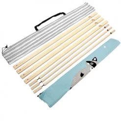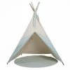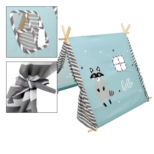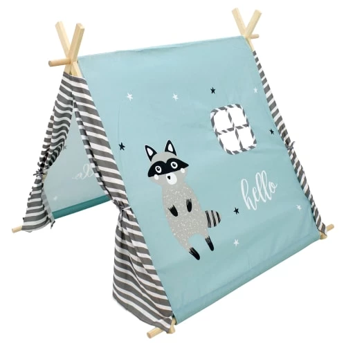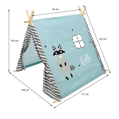 Le joli design en bois naturel et en tissu turquoise avec des étoiles, un motif de raton laveur et des portes de tente rayées gris-blanc attire tous les regards, que ce soit dans la chambre des enfants ou dans le salon. Avec son atmosphère chaleureuse et sa petite fenêtre, la tente est l’endroit idéal pour jouer, se cacher et rêver. Grâce à son sac de transport pratique de même conception et à son montage très facile, la tente est une protection solaire parfaite dans le jardin ou sur la plage, même pendant les chaudes journées d’été.